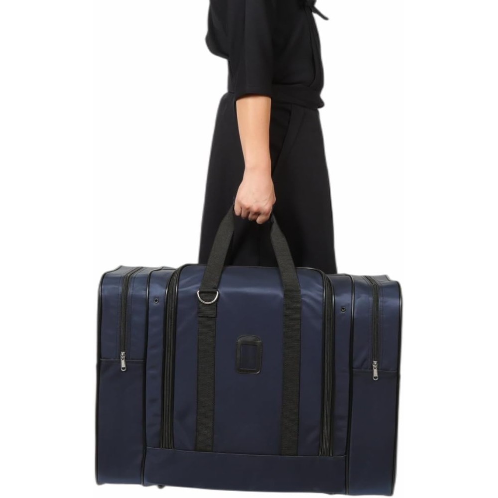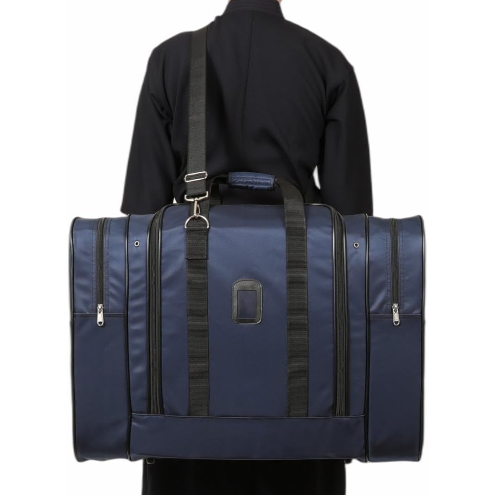 正面のメイン収納部は大きめの大人用防具と剣道着・袴セットが同時に楽々収まります。また、両サイドのファスナーポケットやオープンポケットはタオルや小物類、着替え、パンフレット等を分けて収納するのに便利です。着脱・長さ調整が可能な肩掛用紐も付属し、本体上側の持ち手と2Wayの使い分けが可能。十分な厚みで強度のあるナイロン製ですので耐久性も非常に高く、ある程度の防水力もあるので雨天時も安心です。