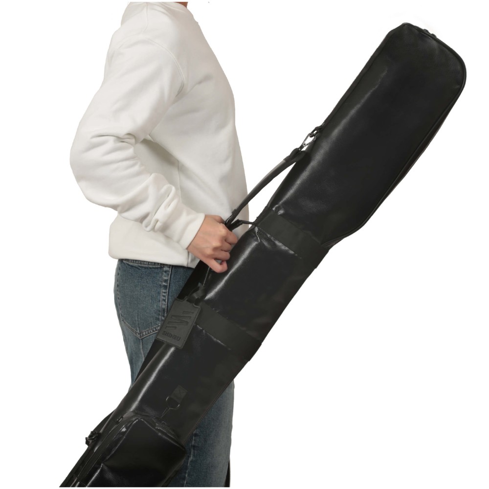 5本の竹刀・木刀を持ち運び可能な実践的な竹刀袋。最大の特徴は下部に備えた取り外し可能なミニショルダーバッグ。大会等で貴重品を入れたまま会場に入り取り外して持ち運びが可能。程よい光沢感で高級感のある表面素材は耐久性も高く、汚れや水気にも強い。